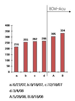 On Oct 1, 2008, he restarted taking medication in healthy circumstance. After receiving three week’s acupuncture trials, the CD4 counts at the 5thblood analysis were remarkably increased from 187 to 594 by 407 points.