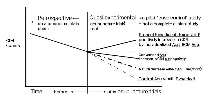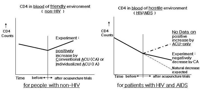 A great deal of useful information was obtained in this study. Eighty percents of participants showed increases in CD4 counts in positive rate as a result of individualized acupuncture trials which were holistically tailored to patient's own constitution physically as well as psychologically. Twenty percents of participants showed decreases in CD4 counts in negative rate as a result of controlled needling trials with the points identified as clinically irrelevant in treating the conditions under investigation. After confirming of drastic decrease in CD4 counts in control group, when new acupuncture trials exactly tailored to participant's own constitution were applied to subjects in control group in order to make the suppressed CD4 counts increase, CD4 counts were drastically increased as shown in Fig 3 and Fig 7. When acupuncture trials exactly tailored to participants were applied, one hundred percents of participants showed increase in CD4 counts in positive rate.